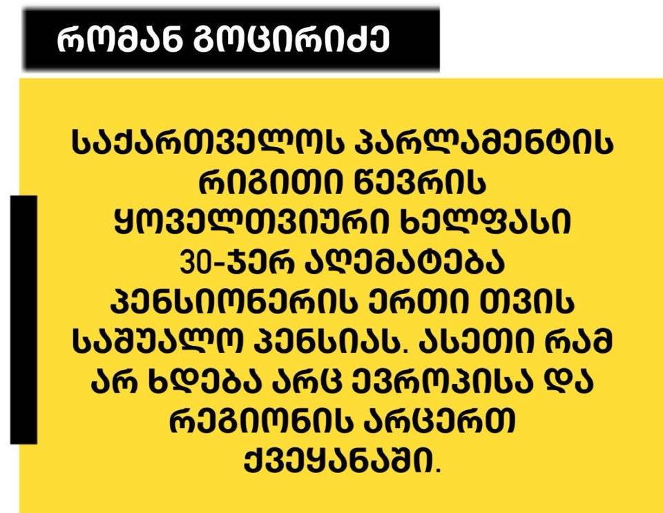 კიდევ ერთი უნიკალური შემთხვევა-საქართველო ლიდერია ევროპაში და რეგიონში დეპუტატის ხელფასის პენსიის ოდენობასთან შედარებით. ქართველი რიგითი დეპუტატის ყოველთვიური ხელფასი დაახლოებით 30-ჯერ აღემატება პენსიონერის ყოველთვიურ პენსიას. პარაზიტები, უსაქმურები და წურბელები-ასე შეიძლება დახასიათდეს ეს კასტა – წერს ფეისბუქის საკუთარ გვერდზე რომან გოცირიძე