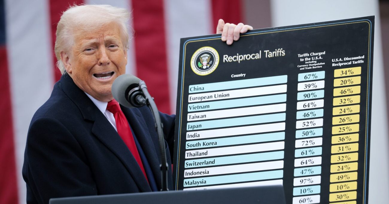 ტრამპმა წარადგინა დიაგრამა, სახელწოდებით, ორმხრივი ტარიფები, რომელშიც სხვა ქვეყნების მიერ აშშ-ს მიმართ დაწესებული ტარიფები შედარებულია აშშ-ს ტარიფებთან.